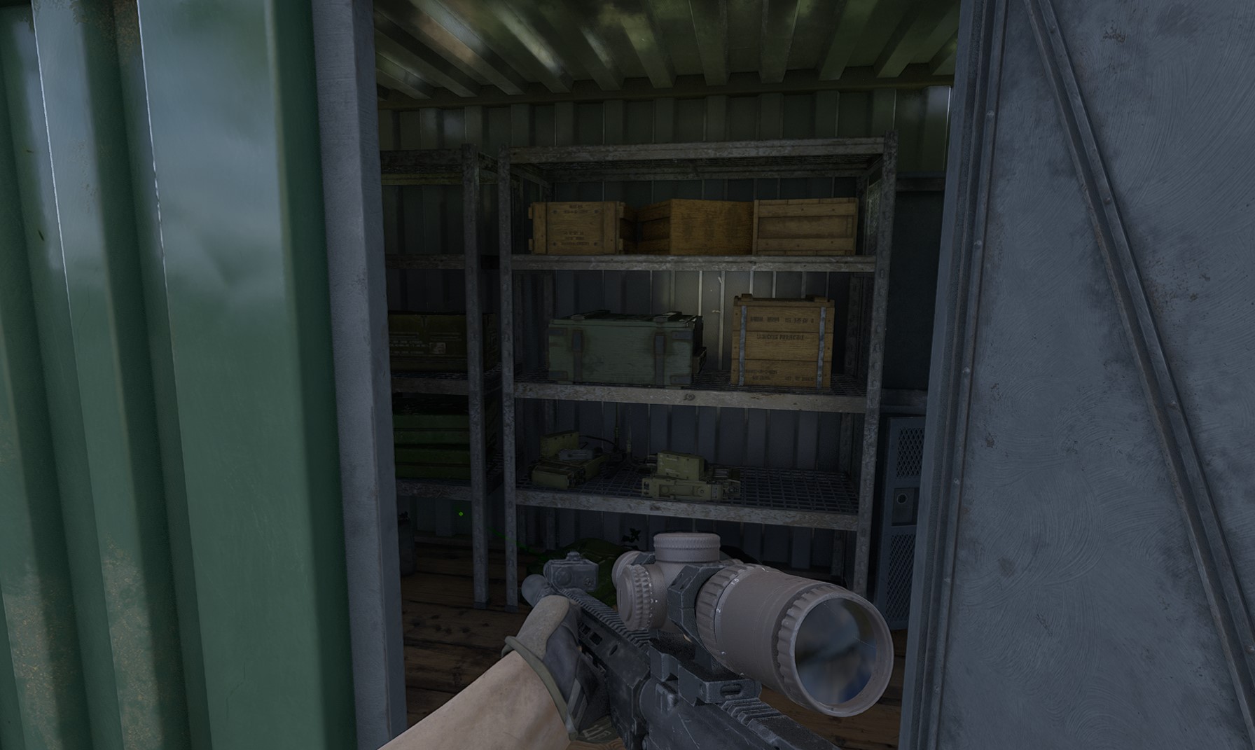 Inside the green shipping container on the shelf.Additional details