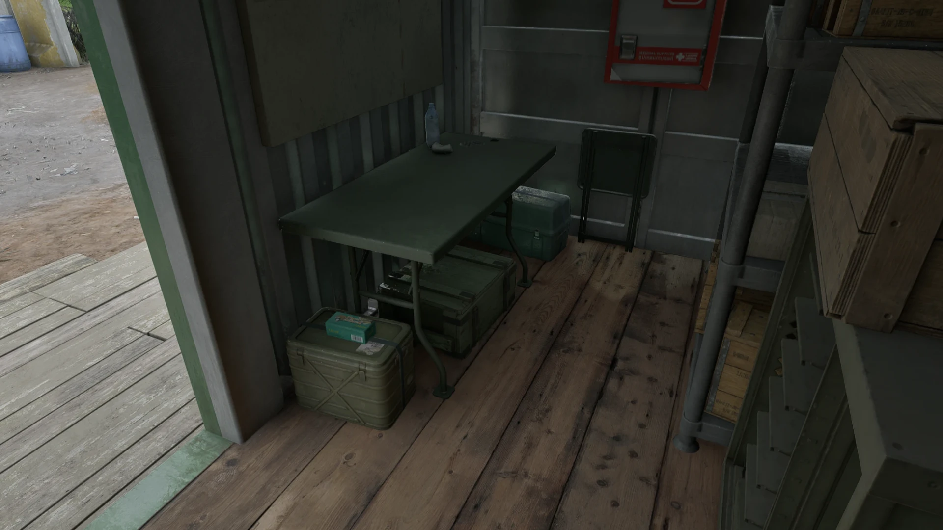 Inside the shipping container, on the floor under the table.